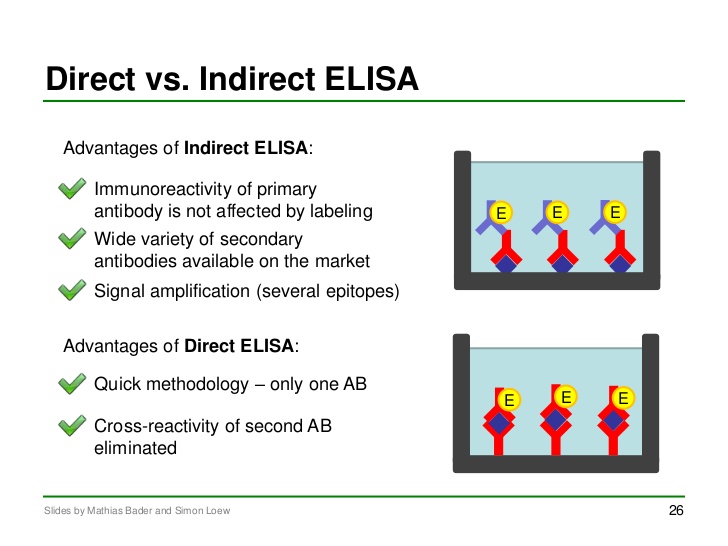 تست ELISA با روش هاي گوناگوني انجام مي شود كه به صورت كلي به دو دسته ELISA مستقيم و غير مستقيم تقسيم بندي مي شود. در روش مستقيم آنتي ژن يا آنتي بادي مورد نظر به طور مستقيم بر سطح فاز جامد پوشش داده مي شود و سپس آنتي بادي يا آنتي ژن مكمل نشاندار شده آن به سيستم اضافه مي شود. با آناليز سيگنال توليد شده مي توان به وجود آنتي ژن يا آنتي بادي مورد نظر در نمونه پی برد. اين روش ارزش تشخيصي چنداني نداشته و بيشتر كاربرد تحقيقاتي دارد.