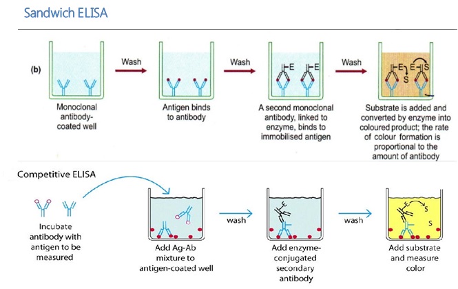روش هاي ELISA ساندويچ و ELISA رقابتي يا مهاري از انواع متداول اين تكنيك هستند. روش ساندويچ كه متداول ترين روش ELISA است، يك آنتي ژن در بين دو آنتي بادي اختصاصي قرار مي گيرد. روش هاي رقابتي نيز بر پايه رقابت دو آنتي ژن يا دو آنتي بادي براي اتصال ليگاند با مقدار محدود استوار است.